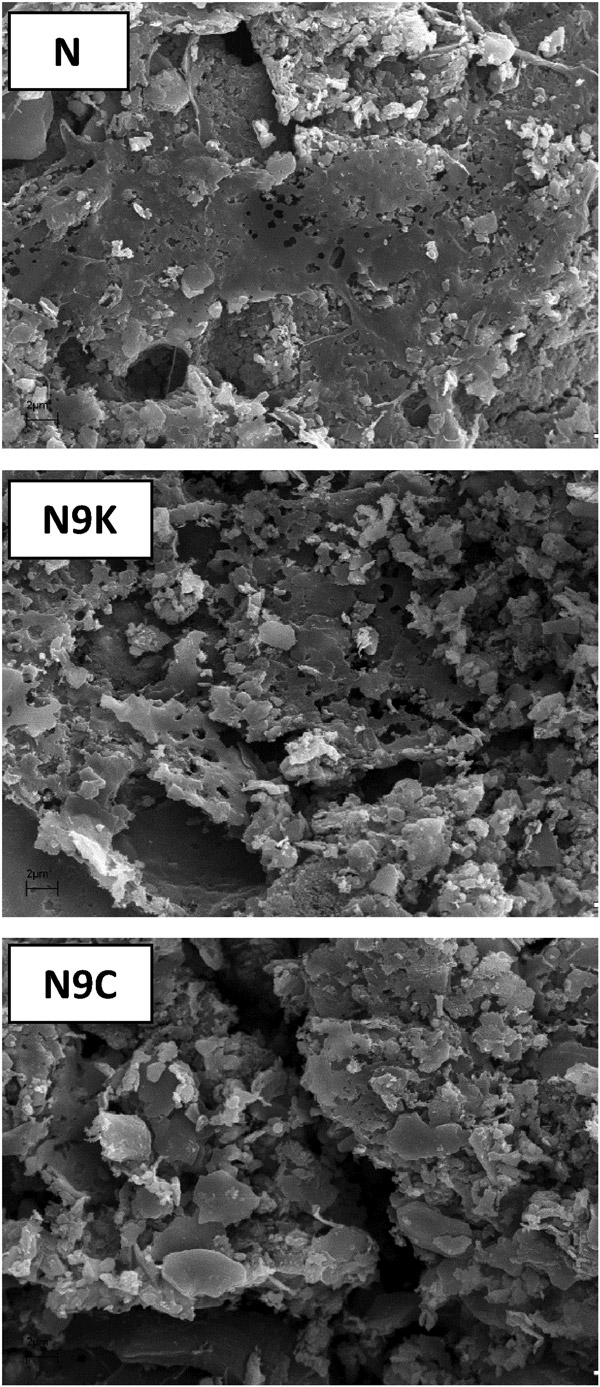 活性炭和經(jīng)改性后獲得的樣品的化學(xué)成分。兩種修飾均導(dǎo)致灰分含量以及結(jié)構(gòu)中特定元素的變化,其中這些變化對N9K樣品而言更大。起始活性炭(N)暴露于碳酸鉀會導(dǎo)致礦物質(zhì)(灰分)的顯著下降,同時(shí)氫含量下降兩倍(可能是碳結(jié)構(gòu)芳構(gòu)化的結(jié)果)由于活性炭顆粒的表面氧化,增加了氧氣量。還值得注意的是,灰分含量比在CO 2中退火的N9C樣品低了近10倍。大氣層。N9K中的灰分很可能是由于活化后將其用5%的鹽酸溶液洗滌而導(dǎo)致的。圖1所示的SEM圖像也證實(shí)了各個(gè)活性炭的質(zhì)地和形態(tài)多樣性。可以看出,根據(jù)制備程序,樣品在尺寸,形狀以及孔的數(shù)量或排列方面存在顯著差異。特別是在活性炭和N9C樣品中可以觀察到的較亮片段可能是其結(jié)構(gòu)中存在灰分(礦物質(zhì))的結(jié)果。