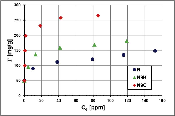 在圖3中比較了初始濃度為100 ppm的活性炭,N9K和N9C表面上初始濃度為100 ppm的聚合物溶液中PAA(Γ)的吸附量。?梢钥闯,對于所有檢查的活性炭,觀察到隨著pH升高聚合物吸附明顯減少。這是由于所檢查系統(tǒng)中的靜電條件從有利的吸引條件(在較低的pH值)變?yōu)椴焕呐懦鈼l件(在較高的pH值)而引起的。而且,在更酸性的環(huán)境中,聚合物鏈的盤繞構(gòu)型使得吸附層的堆積更為緊密(高PAA吸附)。在較高的pH值下,PAA鏈發(fā)展的增加導(dǎo)致表面層中吸附的大分子的構(gòu)型更加延長,其特征是聚合物鏈段的堆積密度顯著降低(PAA吸附低)。