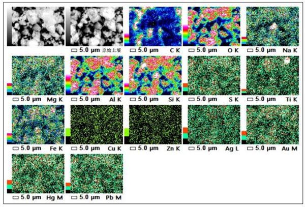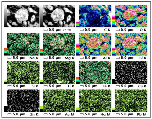 SEM-EDS測試使用了三個(gè)樣本,即A區(qū)域樣本,B區(qū)域樣本和原始土壤樣本。分析了這三個(gè)樣品。尋找的參數(shù)是充當(dāng)污染物的重金屬元素。該測試的結(jié)果顯示了土壤中存在的元素的質(zhì)量百分比。掃描電鏡是一種用于表面觀察的工具,其焦點(diǎn)深度大于光學(xué)顯微鏡,可以直接觀察復(fù)雜的表面而無需復(fù)制。SEM圖像顯示出樣品的形態(tài)狀態(tài),顯示出大小不規(guī)則的團(tuán)塊。同時(shí),EDS分析非常適合揭示樣品中的化學(xué)元素和化合物。EDS的元素映射將為對象表面上的每個(gè)元素賦予不同的顏色,并定量分析每個(gè)元素的百分比。