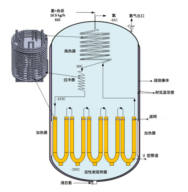 低溫單元是一系列熱交換器,稱為冷阱和活性炭吸附柱,它們浸入裝有液氮的容器中。該系列熱交換器是氦氦換熱器(HE的管中管類型)。過(guò)冷器將氦氣溫度降低至-153°C。吸附器將一根裝有活性炭的U型管立柱。如圖2所示,在色譜柱周圍安裝了一個(gè)電加熱器以進(jìn)行再生。低溫容器是雙壁容器,其中壁之間的間隙中充滿了超絕熱材料。該容器裝有液氮,并將吸附過(guò)程保持在低溫(±180°C)下。