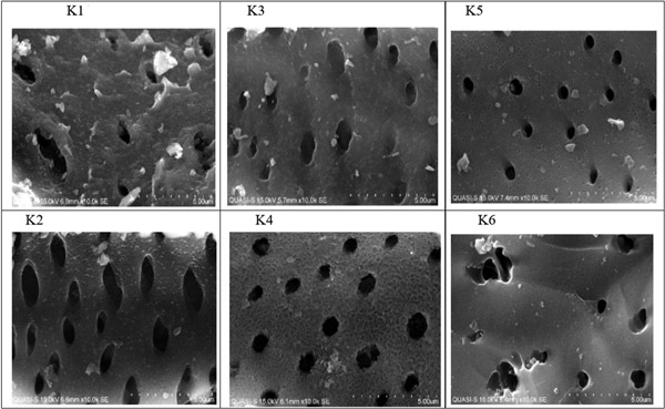 對原始活性炭(圖3中的K1)的掃描顯示出相當均勻的孔。活性炭的結(jié)構(gòu)可以看作是薄片,為不規(guī)則分布和各種尺寸的孔提供了較大的吸附面積。表面上的大多數(shù)可見孔都在5微米范圍內(nèi),這與對椰殼活性炭的預期一致,而在這5微米孔內(nèi)可以看到小于1微米的較小孔。圖3中的K2顯示了在氯酸鹽吸附到表面活性部位后活性炭表面的變化。這些孔有變化的跡象,因為其中一些吸附氯酸鹽,而其他孔被氯酸鹽和氯化物分子阻塞。在10,000倍的放大倍率下,可以觀察到小孔周圍和大孔入口處的沉積,因為預計表面活性基團會大量存在于這些區(qū)域;钚蕴康乃嵝栽偕鷺O有可能形成了表面活性部位,從而增強了活性炭吸附大量氯酸鹽的能力。