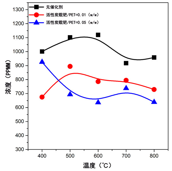 活性炭載鈀催化劑的高表面積歸因于活性炭載體。盡管金屬負(fù)載量為5 wt%,高表面積仍可實現(xiàn)高鈀分散度(42%)。已知活性炭具有很高的熱穩(wěn)定性,因此在熱解過程中大部分保留了活性炭的孔隙率。圖1顯示了在有和沒有鈀催化劑的情況下,由PET熱解獲得的多環(huán)烴和聯(lián)苯衍生物的濃度比較。使用不同的活性炭載鈀催化劑/PET比確定熱解過程中催化劑的作用。隨著熱解溫度的升高,三種類型的多環(huán)烴(2-萘甲酸,芴酮和三亞苯基)的濃度增加,這是因為環(huán)化反應(yīng)在較高溫度下更有利地形成了苯環(huán)。