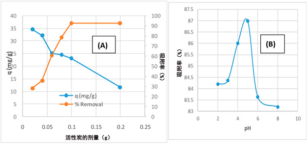 我們研究了不同參數(shù)對(duì)活性炭去除乙酰胺的影響,例如吸附劑的劑量,pH,乙酰胺的初始濃度和接觸時(shí)間。吸附劑的用量是吸附過(guò)程中的重要參數(shù),因?yàn)樗鼪Q定了系統(tǒng)中吸附劑與被吸附物的平衡以及給定濃度下吸附劑的容量。吸附劑劑量對(duì)由活性炭去除啶蟲脒的效果在不同的吸附劑的劑量從0.02-0.2克/100毫升變化進(jìn)行了研究,如圖1。隨著活性炭吸附劑劑量的增加,對(duì)乙酰胺的去除百分率從27.8%增加到92.5%。這可以歸因于活動(dòng)站點(diǎn)數(shù)量的增加。在較高的吸附劑量下,由于聚集體的形成,吸附位點(diǎn)的使用不完全。與去除百分率相反,隨著吸附劑劑量的增加,活性炭對(duì)乙酰胺的吸附能力下降了一些。注意到在0.1g的吸附劑劑量之后,吸附效率沒(méi)有顯示出顯著的增加,這表明了吸附位點(diǎn)的飽和。對(duì)于通過(guò)活性炭去除乙酰胺實(shí)驗(yàn)而言,0.1 g的吸附劑量似乎是合適的。