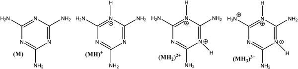 優(yōu)化了活性炭的用量和三聚氰胺溶液濃度范圍的影響,以實現(xiàn)定量分析吸附前后,以及這些研究中使用的所有活性炭中三聚氰胺的最佳條件。最初的實驗涉及不同的吸附劑劑量,以及用于吸附物檢測和定量的多種方法。通過考慮三聚氰胺在水中的溶解度(酸性和堿性條件)以及吸附實驗前后溶液中的可測量水平來選擇三聚氰胺溶液的濃度范圍。由于三聚氰胺(M)是堿,因此它可以在水溶液中經(jīng)歷幾次酸/堿平衡反應并形成不同的質(zhì)子化物質(zhì)(見圖1)。
