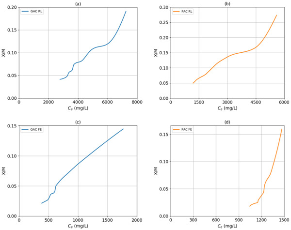 圖1顯示了顆粒活性炭與原浸出液,粉狀活性炭與原浸出液,粉狀活性炭與廢液以及粉狀活性炭與廢液的實(shí)驗(yàn)等溫線。兩個(gè)樣品的曲線和兩個(gè)活性炭對應(yīng)于S形的等溫線(II型)的行為,因?yàn)榍是凹向上,所以多層吸附進(jìn)行活性炭的表面上。利用該信息,就滲濾液而言,不管活性炭顆粒的性質(zhì)和大小如何,都可以假定吸附劑中殘留的化學(xué)需氧量是通過物理吸附發(fā)生的。