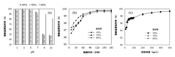 溶液PH影響活性炭的表面電荷。因此,它是控制活性炭吸附過程的重要因素之一。圖2(a)中描述了萘酚藍黑在以40%,50%和60%的活化劑制備的活性炭上的吸附。在所研究的pH范圍內(pH介于1和11之間),萘酚藍黑在活性炭上的吸附是pH依賴性的,尤其是在pH 5和11之間。在低pH值下,活性炭表面帶有凈正電荷。pH的增加導致凈正電荷的減少和凈負電荷的增加。萘酚藍黑是具有負電荷的陰離子染料。在pH值為3時,它會在活性炭表面的活性位點(即,官能團)與被吸附物分子(即,萘酚藍黑)之間引起靜電吸引。活性炭的活性部位與萘酚藍黑色分子之間的靜電排斥作用占主導。因此,可以得出結論,將萘酚藍黑色吸附到活性炭上的pH值選擇為3。另一方面,使用60%活化劑的活性炭吸附時,萘酚藍黑的吸附量比使用40%活化劑活化的活性炭吸附的高,這是由于活性炭產生了更多的孔,盡管在pH 1-3下差異不明顯。