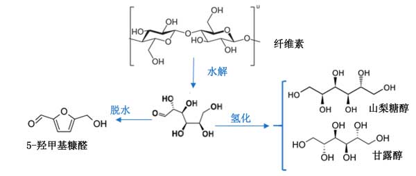 從纖維素中所示產(chǎn)物的反應(yīng)途徑的簡(jiǎn)化方案在圖2展示。在空白試驗(yàn)(無(wú)催化劑)中,纖維素轉(zhuǎn)化率為35%,并且形成了少量的葡萄糖和羥甲基糠醛。在用活性炭負(fù)載的釕催化劑進(jìn)行的測(cè)試中,與空白實(shí)驗(yàn)相比,纖維素轉(zhuǎn)化率顯著提高,并且山梨糖醇收率很高。這些數(shù)據(jù)中的實(shí)驗(yàn)誤差低于5%。