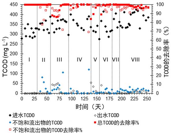 圖2:進(jìn)水中不飽和廢水和總廢水中總化學(xué)需氧量的濃度以及兩種廢水中的去除百分率隨活性炭運(yùn)行時間的變化(d)。