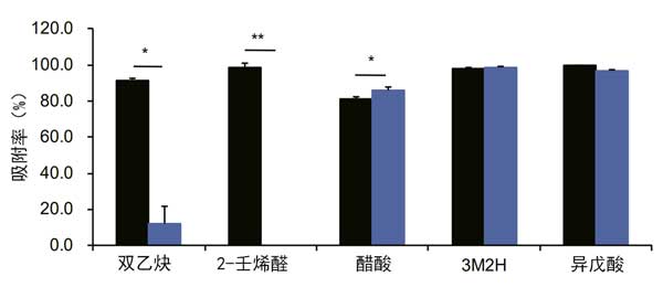 圖2: 活性炭和氧化鋅對(duì)異味揮發(fā)性有機(jī)化合物的吸附能力。黑色和藍(lán)色條分別表示活性炭和氧化鋅。