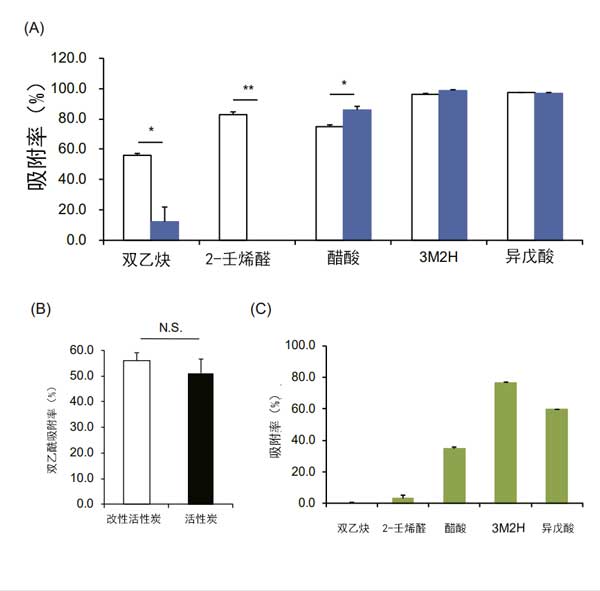 圖3:活性炭對(duì)產(chǎn)生異味的揮發(fā)性有機(jī)化合物的吸附能力。(A)改性活性炭和氧化鋅的吸附水平。(B)使用相同含量的活性炭和改性活性炭,比較改性活性炭和活性炭的二乙;剿。(C)二氧化鈦對(duì)各種VOC的吸附水平。