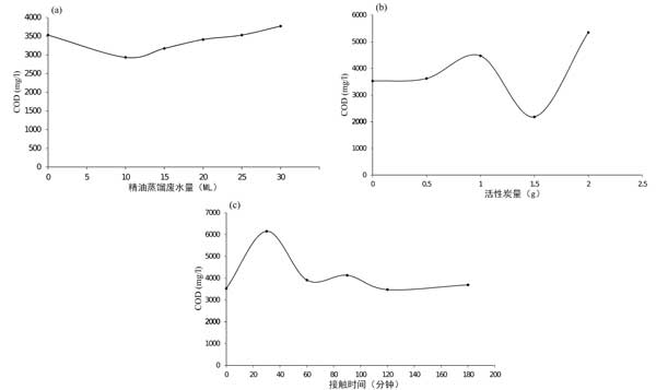 圖2:活性炭的參數(shù)對吸附COD含量的影響:(a)體積,(b)活性炭重量,(c)接觸時(shí)間。