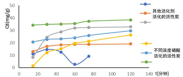 活性炭的吸附時間影響可從圖1看出,活性炭吸附分三步進行:第一是在最初的30分鐘內(nèi),污染物的吸附量很快就被確定了,這可以用在吸附劑的外表面存在大量空置的結(jié)合位點,這使得吸附劑易于吸附到該表面。第二在31分鐘后,吸附速率降低,過程緩慢。活性炭的其他位置達到飽和后,污染物顆粒將遷移到吸附劑內(nèi)部。由于易于接近,因此吸附過程緩慢:顆粒內(nèi)擴散。第三從80分鐘開始,我們觀察到一次接觸,活性炭已達到其最大容量。我們可以說這些吸附劑的平衡時間是80分鐘。然而,磷酸活化的活性炭吸附量的演化曲線顯示,在最初的30分鐘內(nèi),污染物的吸附量顯著增加,此后,污染物的吸附量急劇下降,這將是一種產(chǎn)物解吸。這一現(xiàn)象在其他吸附劑中是不可見的,這可能意味著可用孔隙的數(shù)量和結(jié)合力隨著所用活化劑濃度的增加而增加,這一點還通過碘值和亞甲基藍的值進行了驗證。