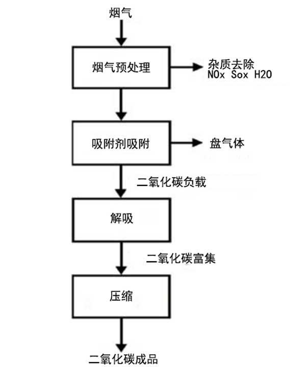 二氧化碳的吸附技術(shù)的簡化圖在圖二顯示。首先將煙氣中的水分,硫和氮氧化物凈化。然后,所制備的氣體進(jìn)入使用固態(tài)吸附劑的吸附階段,例如活性炭,沸石,金屬有機(jī)骨架,多孔聚合物,基于堿金屬和胺的碳酸鹽的固體材料,碳球等。之后,吸附劑進(jìn)入解吸階段,在此階段釋放出富含CO2的氣體混合物,然后在壓力下將其壓縮。該技術(shù)的優(yōu)點(diǎn)是二氧化碳萃取效率高,再生成本低以及吸附劑操作的穩(wěn)定性;钚蕴繉O2和N2的吸附能力很高,具有不同于沸石的大比表面積,并且還可以在潮濕條件下工作。而且,活性炭比沸石具有更低的吸附熱,因此它們可以更容易地再生。因此,在25°C和1bar的溫度下,活性炭的吸附熱為3kJ,而沸石為30kJ。收集二氧化碳的吸附劑質(zhì)量的重要指標(biāo)之一是二氧化碳的吸附量。基本上,在靜態(tài)條件下和動(dòng)態(tài)條件下都進(jìn)行吸附容量的研究。