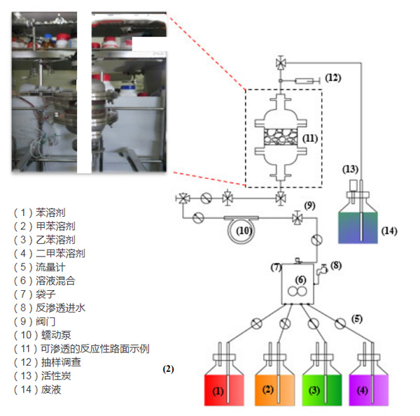 圖1:多孔瀝青路面和可滲透反應(yīng)性路面-活性炭改性瀝青吸附的實(shí)驗(yàn)裝置。