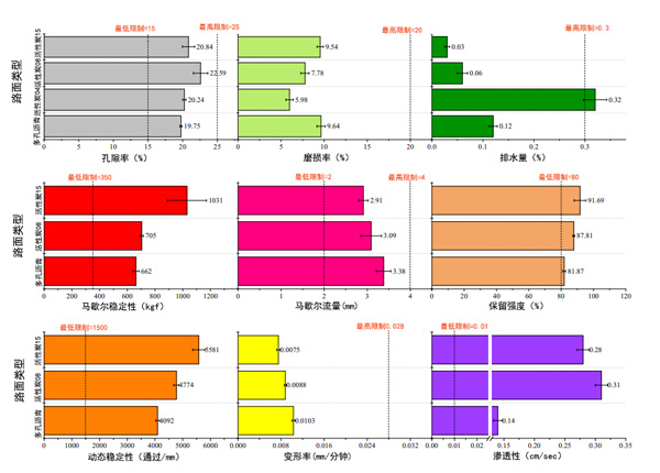 圖2:活性炭和多孔瀝青的調(diào)節(jié)性能(空隙,磨耗,排水,馬歇爾穩(wěn)定性,馬歇爾流量,保留強(qiáng)度,動(dòng)態(tài)穩(wěn)定性,變形率和滲透性)的比較。