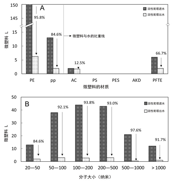在污水處理廠的進水和出水中觀察到未處理的污水樣品中觀察到七個不同的微塑料顆粒,包括聚乙烯(PE),聚丙烯(PP),丙烯酸酯(AC),聚苯乙烯(PS),聚酯(PES),醇酸樹脂(AKD)和聚四氟乙烯(PTFE)。PE是最豐富的MP材料類別,占MP顆?倲(shù)的72%,其次是PP(13%),AC(6%)和其他分數(shù)相對較小的聚合物(1-4%)。假定樣品中微塑料材料類別的數(shù)量順序與原料的比重有關(guān)。具有較低比重的微塑料顆粒可以通過從污水源沉降到污水處理廠的過程中,以較低的重力進行更有效的輸送。在中試規(guī);钚蕴垦b置的進水和出水中觀察到的MP顆粒的數(shù)量濃度和尺寸分布分別顯示在圖2AB中。通過活性炭處理,可以顯著提高微塑料的去除率(92.9%)。特別是,發(fā)現(xiàn)活性炭處理在去除比水輕的微塑料(例如PE和PP)以及所有尺寸范圍的微塑料(包括20–50µm尺寸)方面都是有利的,而初級和生物處理很少去除這些微塑料。關(guān)于微塑料去除效率,配備活性炭過濾系統(tǒng)的飲用水處理廠獲得了類似的結(jié)果(大約89%的去除率)。