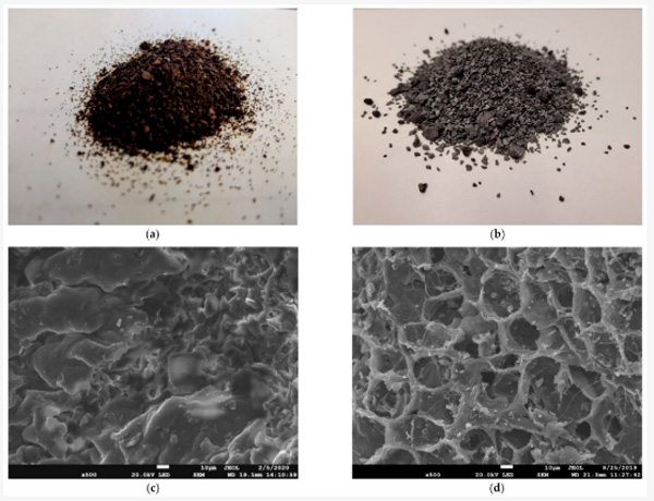 圖1:(a)處理后獲得的原材料和(b)活性炭,以及(c)原材料和(d)活性炭在500x下的SEM圖像。