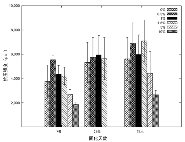 在7天,21天和28天測量立方體樣品的抗壓強度。每個代表性的抗壓強度是十二個樣品的平均值。強度的測量是使用混凝土壓縮機進行的。根據(jù)抗壓強度試驗結(jié)果,由于在7天時測得的強度大大降低,因此未測試21天時5%和10%活性炭的樣品。結(jié)果證明,普通水泥砂漿的抗壓強度隨養(yǎng)護時間的增加而增加。在活性炭復(fù)合材料樣品中也觀察到了相同的趨勢。沒有活性炭的水泥砂漿的7天強度達到28天強度的66%,而0.5%和1%活性炭復(fù)合材料的7天強度分別達到28天強度的80%和73%。這意味著低濃度的活性炭可能會加速強度硬化過程。等于或大于1.5%的過量濃度消除了早期強度效應(yīng)。此外,活性炭的過量含量大于5%導(dǎo)致強度顯著降低。添加5%的活性炭會使普通水泥砂漿的7天抗壓強度降低28%,而28天抗壓強度降低21%。添加10%會使7天強度下降50%,而28天強度下降52%。這些結(jié)果表明,大于合適范圍的活性炭的摻入會損害普通水泥的強度。在該研究中,觀察到增加抗壓強度的合適含量范圍為0.5%至1.5%。