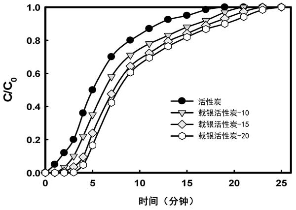 圖3:活性炭和活性炭載銀復(fù)合材料的乙醛吸附穿透曲線。
