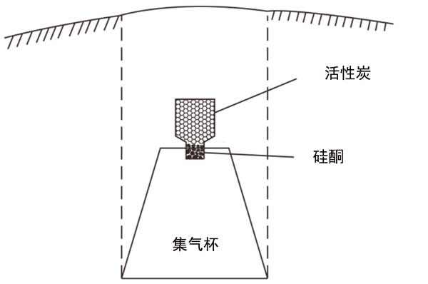 所用儀器為活性炭氡檢測儀。在現(xiàn)場調(diào)查中,將使用過的活性炭烘烤干燥。冷卻后,將活性炭按照適當(dāng)?shù)臉?biāo)準(zhǔn)放入取樣器中,用硅膠塞規(guī)避地下水分的影響,然后將樣品密封備用。接下來,將裝滿的采樣器口朝下放置在測試坑中,如圖1所示。采樣器和集氣杯穩(wěn)定固定,上面蓋上塑料布,密封坑口。當(dāng)埋杯到預(yù)設(shè)時間(至少5天)時,取出采樣器,仔細(xì)填寫采樣時間和氣候。然后將采樣器放入經(jīng)過測試和校準(zhǔn)的活性炭氡氣檢測儀中,記錄每個采樣器的線數(shù)和點(diǎn)數(shù)。