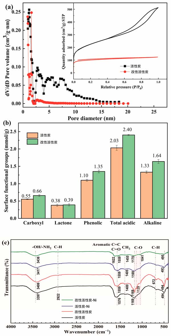 圖1:活性炭和改性活性炭的表征:(a)孔徑分布和氮氣吸附-解吸等溫線;(b)通過Boehm滴定進行表面官能團分析;(c)Ni(II)吸附前后的FTIR光譜。
