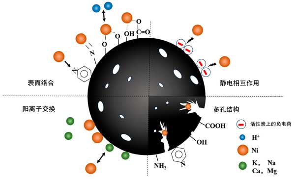 活性炭改性后高效去除廢水中的鎳,用了一種新的改性方法來制備活性炭。改性劑為硫酸四氨合銅(II)一水合物([Cu(NH3)4]SO4·H2O)。活性炭通過吸附有效去除水中的Ni(II)。與未改性的活性炭相比,活性炭的改性導(dǎo)致比表面積和總孔體積降低,而改性導(dǎo)致比表面積和總孔體積增加氧和氮的存在,表明含O和含N官能團的結(jié)合。改性活性炭相對于活性炭表現(xiàn)出優(yōu)異的吸附能力。值得注意的是,改性活性炭表現(xiàn)出強大的緩沖能力和對pH變化的適應(yīng)性。Ni(II)在活性炭上的吸附機制包括表面絡(luò)合、陽離子交換和靜電相互作用。本研究概述了一種經(jīng)濟有效的方法來制備用于吸附廢水中Ni(II)的活性炭,并闡明了潛在的吸附機制。