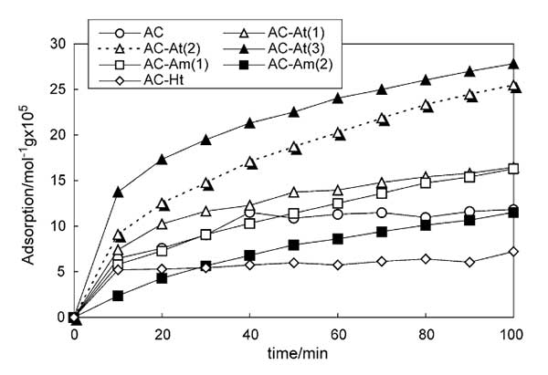 實(shí)驗(yàn)條件:在N2中使用210ppm的甲硫醇作為甲硫醇?xì)怏w;钚蕴康闹苽洌钚蕴客ㄟ^碳化隨后活化制備。用蒸汽進(jìn)行活化。用HNO3/H2SO4溶液進(jìn)行活性炭的酸處理。將1克活性炭在100立方厘米HNO3/H2SO4溶液中在室溫下攪拌0.5小時(shí)。過濾分離經(jīng)過處理的活性炭,并在超聲條件下用去離子水洗滌數(shù)次,直到水的pH值達(dá)到5以上。然后將活性炭在100℃空氣中干燥12小時(shí),在150℃下真空干燥1小時(shí)。用HNO3,HNO3/H2SO4(1/1比例)和HNO3/H2SO4(1/3比率)處理的活性炭分別表示為AC-At(1.2.3)。胺化合物對活性炭的改性通過十六胺的吸附來進(jìn)行。將活性炭浸入十六烷胺/乙醇溶液中并在室溫下攪拌30分鐘。然后過濾分離活性炭并在室溫下真空干燥2小時(shí)。由4×10-6和3.3×10-5摩爾m-3十六胺溶液制備的活性炭分別表示為AC-Am(1.2);钚蕴(AC-Ht)的熱處理在Ar氣氛中在600℃下進(jìn)行2小時(shí)。