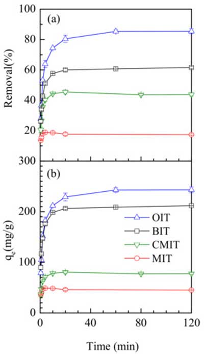 初始異噻唑酮濃度為15-35mg·L-1時(shí)進(jìn)行吸附動(dòng)力學(xué)實(shí)驗(yàn)。圖1顯示了隨著時(shí)間的推移活性炭上的異噻唑酮吸附。不同異噻唑酮的去除百分比在前20分鐘內(nèi)變化,之后它們穩(wěn)定,表明正在接近平衡狀態(tài);钚蕴客ǔ?焖龠_(dá)到平衡,而吡蟲啉和DOC的吸附在最初30分鐘內(nèi)達(dá)到平衡。異噻唑酮的去除順序?yàn)椋篛IT(85%)>BIT(62%)>CMIT(44%)>MIT(17%),對(duì)應(yīng)的吸附量為OIT(243mg·L-1)>BIT(212mg·L-1)>CMIT(77mg·L-1)>MIT(45mg·L-1)。