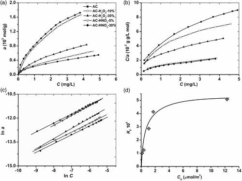 圖2.活性炭吸附銅離子研究(a)實驗并擬合Langmuir(b)和Freundlich(c)模型和(d)KF對CA的擬合。