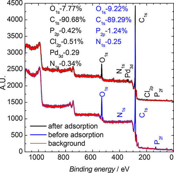 吸附過程之前和之后材料的完整XPS光譜如圖2所示。考慮到觀察到的溶液中Pd(II)濃度的降低,估計鈀負載等于0.7%(m/m)?梢钥闯鰜碜遭Z的峰出現(xiàn)。對這個峰值進行更深入的分析可以為我們提供有關(guān)鈀電子結(jié)構(gòu)的信息。