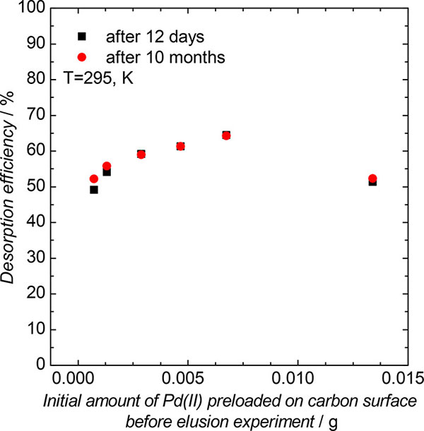 在活性炭表面存在二氯化鈀的情況下,應(yīng)該可以根據(jù)方程解吸它。因此,解吸試驗在室溫(20℃)進行,使用100厘米3鹽酸(濃度為1mol·kg-1)或100厘米3的高氯酸鹽酸(濃度1mol.kg-1)。必須提及的是,吸附實驗在pH等于1下進行,而汽提過程在pH等于0下進行。由鈀(II)負載的活性炭樣品取自先前的吸附實驗。通過過濾將預(yù)加載的活性炭與溶液分離,然后在60℃下干燥。接著,將干燥的預(yù)加載的活性炭與鹽酸溶液混合。解吸試驗進行約10個月。在前2天,觀察到溶液中鈀(II)濃度的快速增加,最終在12天后獲得恒定值。這些結(jié)果如圖4所示作為黑色方塊。為了確保這確實是最終的平衡,樣品在接下來的10個月內(nèi)留在溶液中。在此時間之后獲得的值顯示為紅點。過量的鹽酸是顯著的,它應(yīng)該足以溶解二氯化鈀。結(jié)果表明,平衡狀態(tài)不受時間影響,表明觀察到的狀態(tài)是最終狀態(tài)。似乎在該實驗期間,只有約50-65%的鈀(II)物質(zhì)可以從活性炭表面洗脫。如上所述,施加過量的鹽酸。因此,一方面,不完全洗脫可以通過Pd2 OCl2的形成來解釋或活性炭表面上的另一種鈀(II)化合物。另一方面,它可能僅僅與出現(xiàn)與初始狀態(tài)不同的新平衡狀態(tài)有關(guān)。為了切斷推測,進行簡單的第二次解吸試驗,其中使用來自第一次解吸試驗的活性炭。實驗條件和程序與第一次解吸試驗期間的相同。觀察到鈀(II)的洗脫再次發(fā)生。在最初的24小時后,高達17%的剩余鈀(II)被解吸,而在2個月后,總解吸效率達到98.4%的水平。