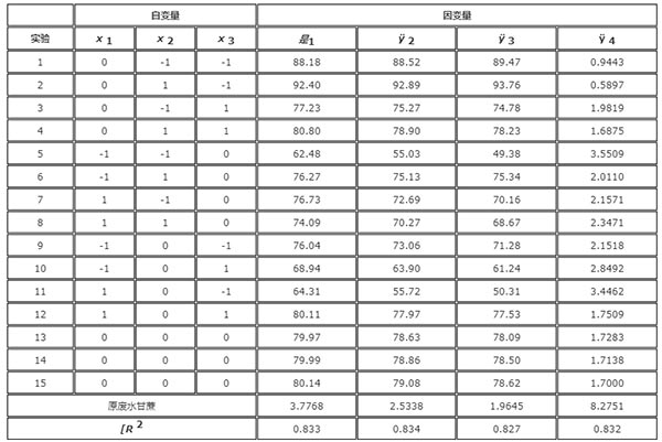 圖1示出了一組測(cè)定的實(shí)驗(yàn)條件(表示為編碼變量)和因變量所獲得的實(shí)驗(yàn)數(shù)據(jù)y1-y4,以及有關(guān)廢水的顏色化合物的參數(shù),與活性炭處理前的參數(shù)。