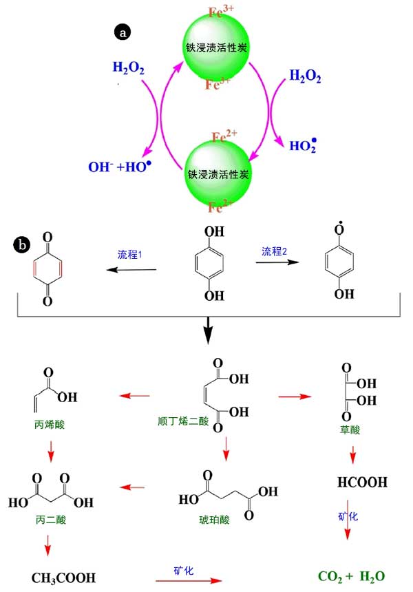 各種類型如羥基(HO•)和過(guò)氧羥基(HOO•)自由基的從而起到在苯二酚的氧化重要作用是由各種鐵化合價(jià)的氧化-還原反應(yīng)生成的鐵(Fe(III)/Fe的(II))存在于的鐵浸漬活性炭催化劑在過(guò)氧化氫的存在下進(jìn)行。氧化反應(yīng)得到由形成絡(luò)合物開始Fe(III)的-OH基團(tuán)。代在表示這些基團(tuán)的機(jī)制圖2(a)中。這些自由基氧化苯二酚(ⅰ)吸附在催化劑,(ⅱ)存在于催化劑的附近和(iii)在本體溶液中。的苯二酚氧化機(jī)理示于圖2(b)中。苯二酚在其氧化形式各種中間體取決于氧化的階段。它形成的中間體,在此期間被氧化成羧酸,如馬來(lái)酸,草酸,丙烯酸,琥珀酸,丙二酸,乙酸和氧化的后面酸氧化的初期階段,例如苯醌和CO 2和H 2 O的充分氧化。