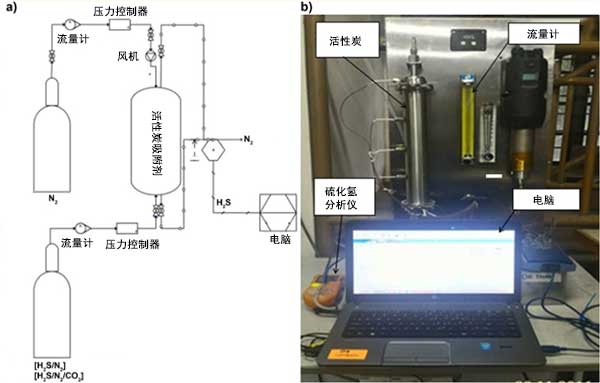 在設計為0.3米長的實驗室規(guī)模的單吸附塔單元中檢查六種活性炭對硫化氫的吸附性能。每種活性炭的高度指的是不同的活性炭載荷,分別為0.032kg,0.105kg和0.155kg。通過單次進料H 2 S/N 2(1000 ppm H 2 S余量N 2)或H 2 S/N 2/CO 2(1000 ppm H 2)的混合氣體觀察吸附性能。圖1(A)和圖1(B)分別顯示了硫化氫吸附系統(tǒng)的示意圖和實際照片。