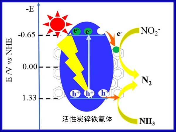 在紫外可見光照射下,基于活性炭鋅鐵氧體催化劑通過兩個步驟成功地同時去除亞硝酸鹽和氨。通過氣相色譜檢測產(chǎn)物表明在光催化過程中氮氣被釋放出來。XPS測量和鋅鐵氧體能帶結構分析表明,鋅鐵氧體的還原電位低于亞硝酸鹽的還原電位,因此光生電子可以在照射下將亞硝酸鹽還原為氮氣。對比下高于氨的電位,因此光生空穴可以將氨氧化成氮氣;钚蕴恳饚兜募t移,光生電子空穴對的分離,亞硝酸鹽和氨的吸附,促進光催化活性。
