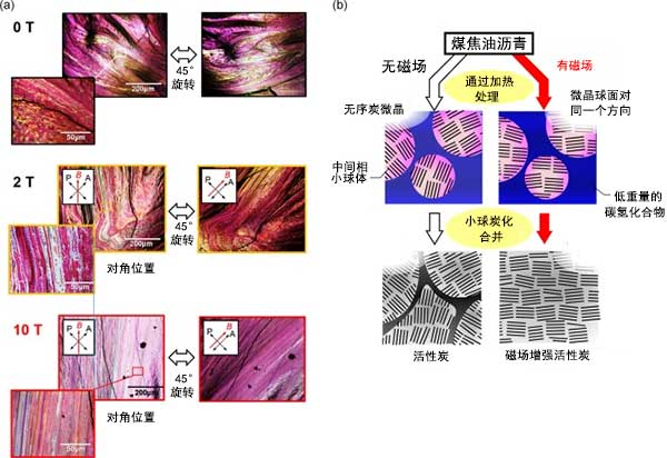 圖2:(a)在沒有和存在2T和10T的磁場(chǎng)的情況下制備的活性炭前體材料的偏振顯微鏡圖像。(b)對(duì)煤焦油瀝青的碳化過程的磁場(chǎng)效應(yīng)的示意圖。
