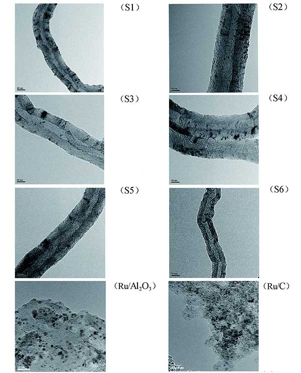所有載釕活性炭上的釕負載量理論上為5%。通常,將活性炭加入120mL乙二醇中。并將混合物在超聲處理30分鐘以確;钚蕴烤鶆蚍稚。超聲處理后,在連續(xù)攪拌下滴加3.0mL RuCl 3水溶液30分鐘。然后是使用NaOH乙二醇溶液將混合物的pH調節(jié)至4.0。然后,在連續(xù)攪拌24小時后,將溶液放入微波合成反應器中加熱100秒。過濾混合物溶液,用去離子水洗滌直至濾液的pH達到7.0,并在80℃下真空干燥。將樣品研磨成粉末使用。由于活性炭的表面是疏水的,它們傾向于在極性溶劑中聚集。并且由官能團改性的活性炭可以提供足夠的孔隙以使釕納米顆粒均勻地分布在活性炭的表面上。在通過微波加熱的多元醇方法制備活性炭負載的釕納米顆粒。合成過程如圖1所示。