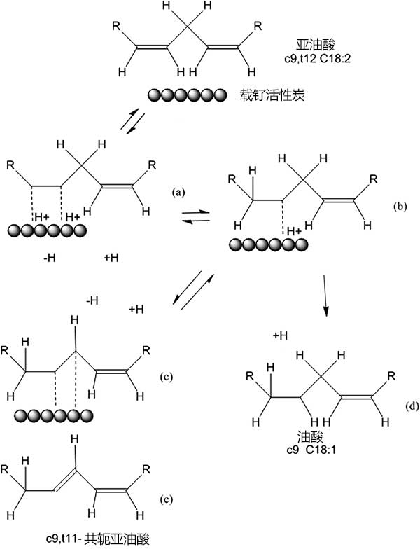 我們選擇兩種典型的商用催化劑(Ru/Al 2 O 3和Ru/C)來異構化棉籽油用于比較。在相同條件下選擇165℃作為反應溫度,并使用800rpm的攪拌速率以確保催化劑均勻地分散在基材中。根據(jù)反饋的數(shù)據(jù)得知,六種載釕活性炭催化劑的棉籽油中亞油酸的轉化率為7.93%至37.66%,六種活性炭催化劑的總共軛亞油酸產率為2.25%至15.91%。已知載體材料的性質和金屬的氧化還原態(tài)會影響化學吸附并影響金屬催化劑的催化性能。根據(jù)結果所有載釕活性炭表現(xiàn)出比兩種商用催化劑更好的催化性能,這可以促進金屬與載體相互作用。亞油酸到共軛亞油酸的異構化過程可以用一種機理來解釋,該機理描述了烯烴的氫化和異構化。如圖4所示,有幾個步驟:(a)亞油酸化學吸附在釕表面上。(b)氫原子從釕表面解吸,形成半氫化中間體。(c)飽和鍵的形成或(d)相鄰氫的抽取,導致形成二吸附的絡合物。(e)幾何和/或位置異構體的解吸附。當釕表面上吸附的氫高時,將發(fā)生半氫化中間體的氫化(步驟(c)。在本次研究中,催化劑未被氫預活化使釕表面上吸附的氫氣較低,使反應趨于異構化而不是氫化。此外,由于活性炭的電子給體性質,釕納米顆粒與活性炭之間存在金屬與載體的相互作用,其阻止釕的再氧化并增加亞油酸和釕接觸的機會以獲得更好的綴合結果。這可用于解釋為什么所有載釕活性炭都表現(xiàn)出比商用催化劑更好的催化性能。