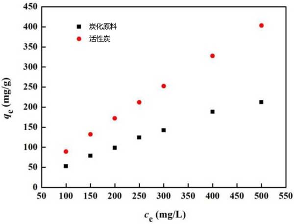 吸附等溫線:吸附等溫線對于描述溶質(zhì)如何與吸附劑相互作用非常重要,并且對于優(yōu)化吸附劑的使用至關(guān)重要。Langmuir等溫線假定單層吸附在含有均勻策略和吸附的有限數(shù)量的吸附位點(diǎn)的表面上,而在表面平面內(nèi)沒有吸附物的遷移。圖4顯示了柴油在所制備活性炭上的平衡吸附等溫線。從圖中可以看出,與炭化原料相比,活性炭的吸附等溫線更接近直線。隨著柴油溶液濃度的增加,活性炭對柴油溶液的吸附能力不斷增加。當(dāng)柴油濃度為500 mg/L時(shí),活性炭達(dá)到最大吸附量。然而,當(dāng)柴油溶液濃度達(dá)到400 mg/L時(shí),炭化原料的吸附容量增加緩慢?赡苁遣裼皖w粒覆蓋了材料的表面,導(dǎo)致吸附速率降低。從圖4中可以清楚地看出,活性炭的吸附能力明顯強(qiáng)于炭化原料。