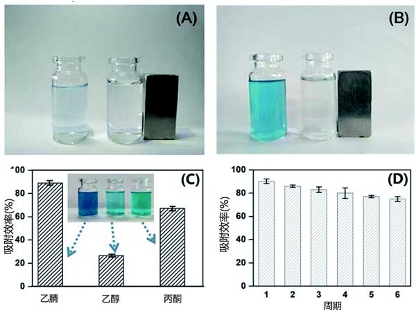 活性炭的回收和再利用是在實際應用中需要考慮的關鍵因素。因此,我們調查了活性炭的恢復和可重用性。通過外部磁體很容易將活性炭與水溶液分離(圖3A和B)。通過使用乙腈,乙醇和丙酮作為洗脫液輔助超聲來再生裝載孔雀石綠的活性炭。乙腈的解吸效率優(yōu)于乙醇和丙酮,解吸效率分別為90.2%,35.7%和71.3%(見圖3C);钚蕴吭诮馕驮偕笫欠(wěn)定的。此外,六個循環(huán)后沒有明顯的吸附效率損失(圖3D)。對活性炭的快速吸附,大吸附容量和良好的可重復使用性促使我們研究其實際應用。將活性炭分散在含有加標孔雀石綠(25mg L-1)的廢水中。在用外部磁體快速吸附和分離活性炭后獲得澄清的上清液(圖3A和B)。結果表明,活性炭是一種經(jīng)濟有效的高性能吸附劑,用于孔雀石綠吸附和去除廢水。