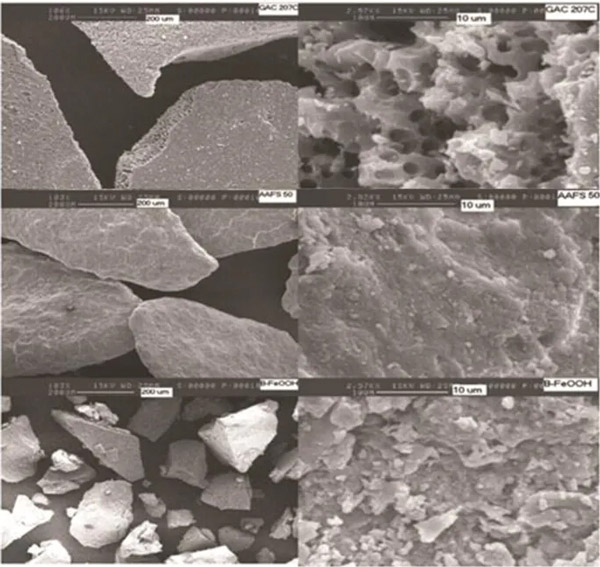 圖2顯示了吸附劑的SEM圖像。活性炭晶粒的撕裂邊緣也顯示出內(nèi)部“孔”。其內(nèi)部結(jié)構(gòu)可以被認(rèn)為是碳板的石墨型分層;罨^程中產(chǎn)生的孔隙和大量碎屑導(dǎo)致了這種吸附劑的易碎性。AAFS晶粒顯示出相同的傾斜形狀,表面看起來光滑且具有均勻的涂層。在更大的范圍內(nèi),僅可見很少的裂縫或孔洞,這表明表面積主要在外部。β-FeOOH的表面具有高脆性,因此表面光滑且?guī)в写罅克樾。多孔結(jié)構(gòu)與SEM照片非常吻合(圖2),說明了活性炭的片狀結(jié)構(gòu)及其眾多的空洞,而鐵化合物則顯得光滑,只有很少的裂紋;罨^程中產(chǎn)生的孔隙和大量碎屑導(dǎo)致了這種吸附劑的易碎性?紤]規(guī)模,中孔和大孔上看到照片(尺寸以上2.5 μ M)。β-FeOOH的表面易碎,因此表面光滑,帶有大量碎屑。該刻度不允許人們區(qū)分赤霞石微晶(FeOOH的β形式)的特征桿雪茄形狀。