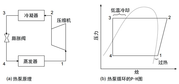 熱泵是空調(diào)的熱力學(xué)原理,可以基于狀態(tài)點(diǎn)的熱物理特性來(lái)預(yù)測(cè)熱泵的熱力學(xué)性能。圖2(a)顯示了典型熱泵的示意圖,圖2(b)顯示了壓力-焓線圖上的熱泵循環(huán)。在我們的模擬中,不僅計(jì)算了每種狀態(tài)下的熱物理性質(zhì),而且還計(jì)算了蒸發(fā)器和冷凝器中的熱交換過(guò)程。由于換熱器規(guī)格的可用性限制,所以將換熱器建模為雙管逆流式換熱器,該換熱器用于我們的實(shí)驗(yàn)裝置中。