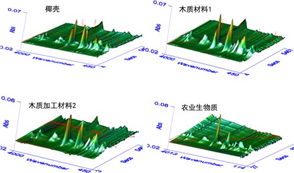 圖1:四種生物質樣品熱解過程中氣態(tài)產物的3D FTIR吸收光譜。